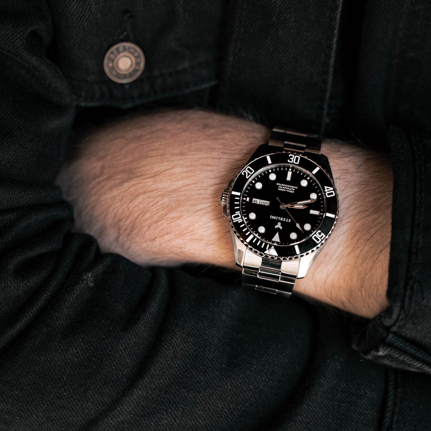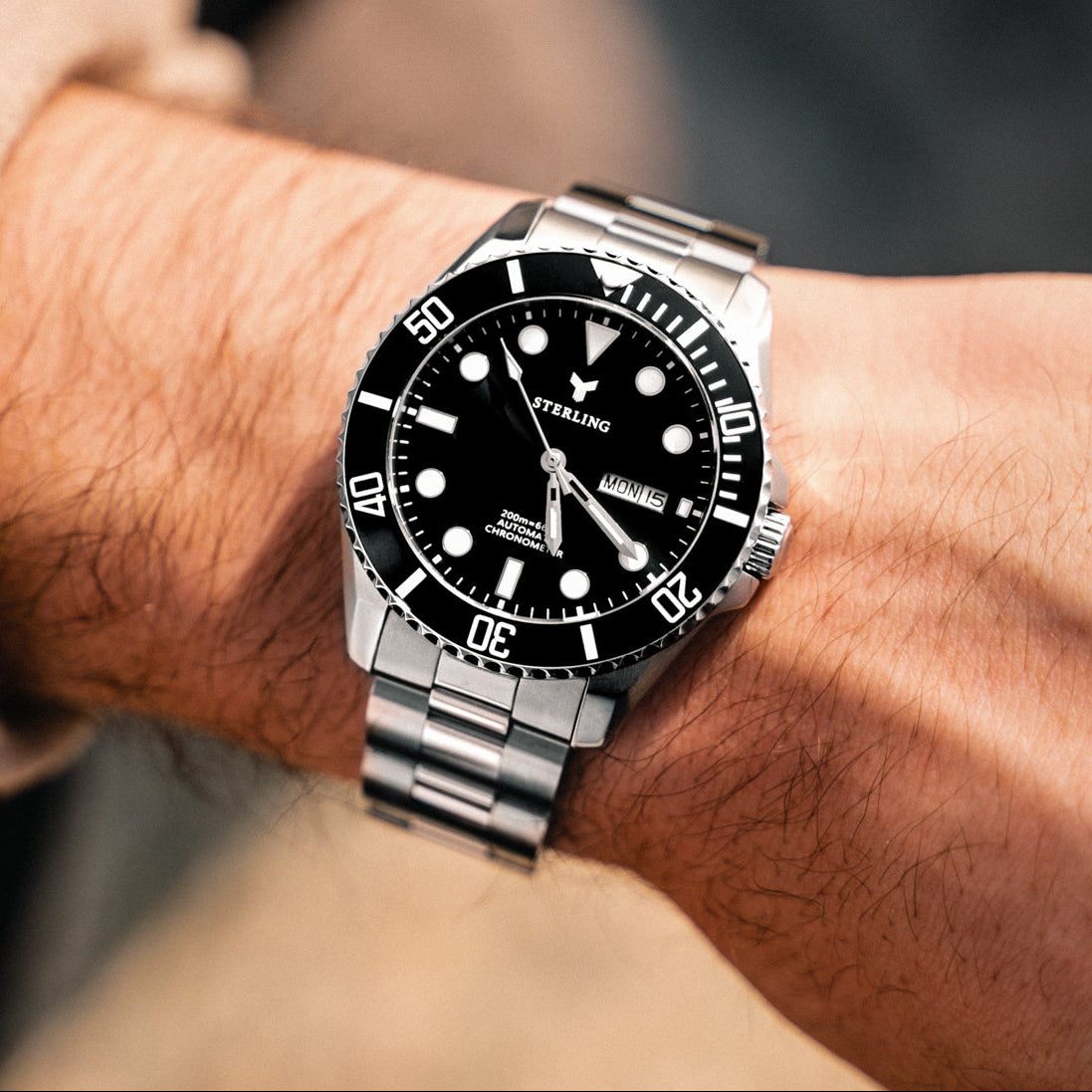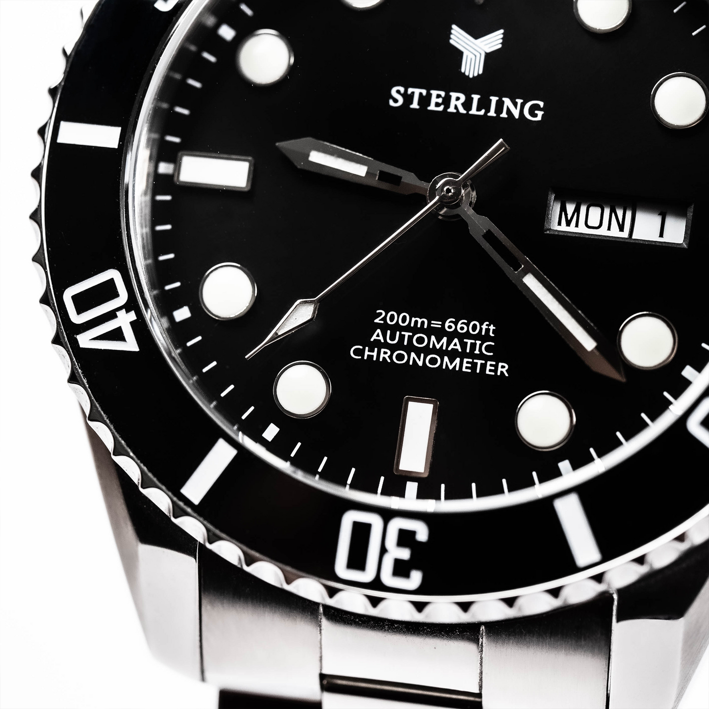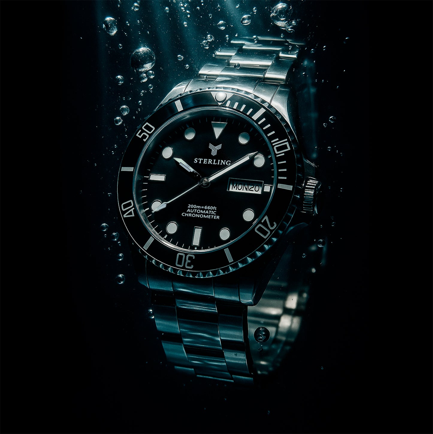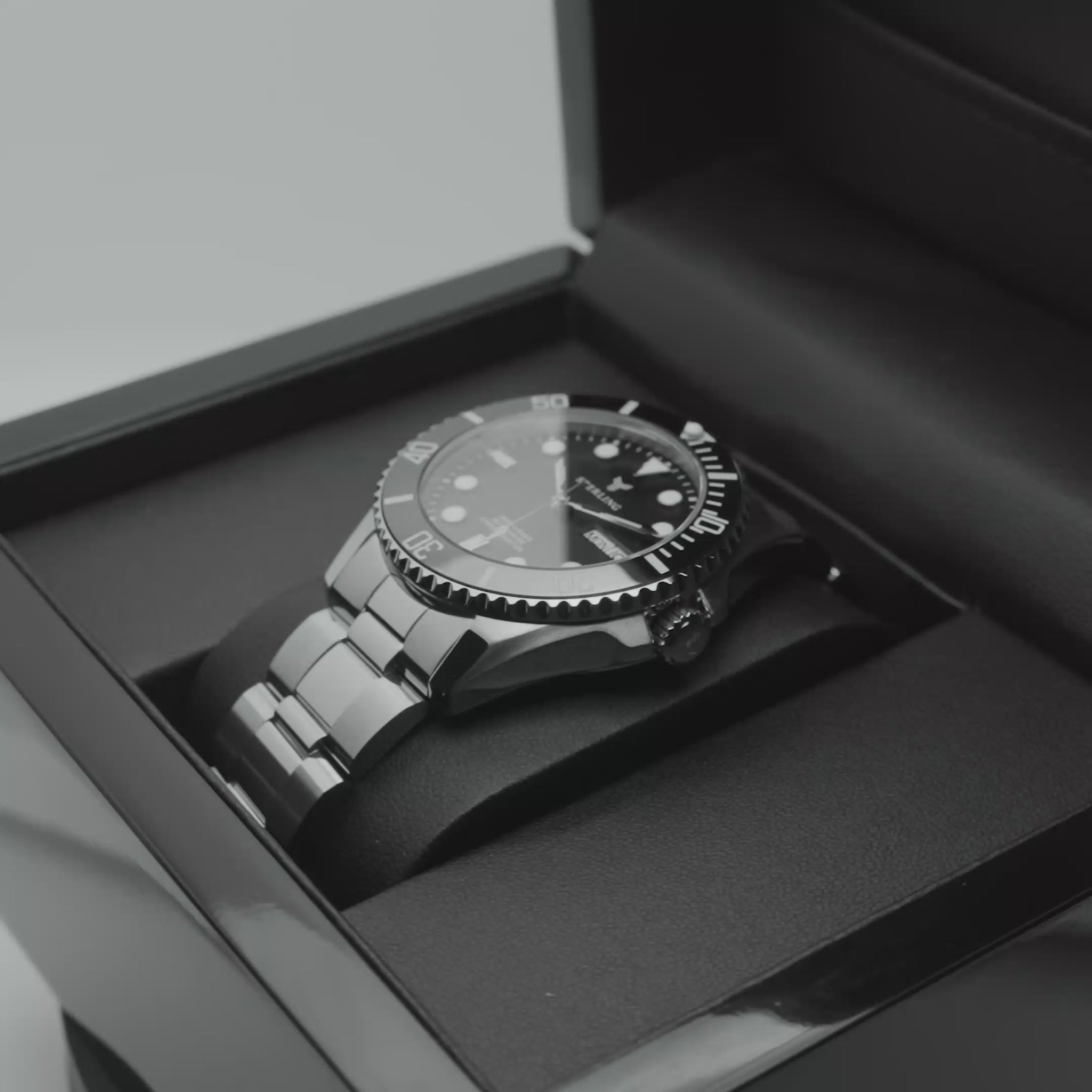 Sterling Descend er en hyldest til det legendariske Rolex Submariner. Vi har justeret detaljerne efter vores præferencer og har formet et fantastisk alternativ til det ikoniske ur. Med vores egen urkasse, rem og visere karakteriserer vi vores egen stil, uden at gå på kompromis med den oprindelige Submariner charme. Sterling Descend er udrustet med ridsefrit safir krystalglas og er vandtæt ned til 200m.