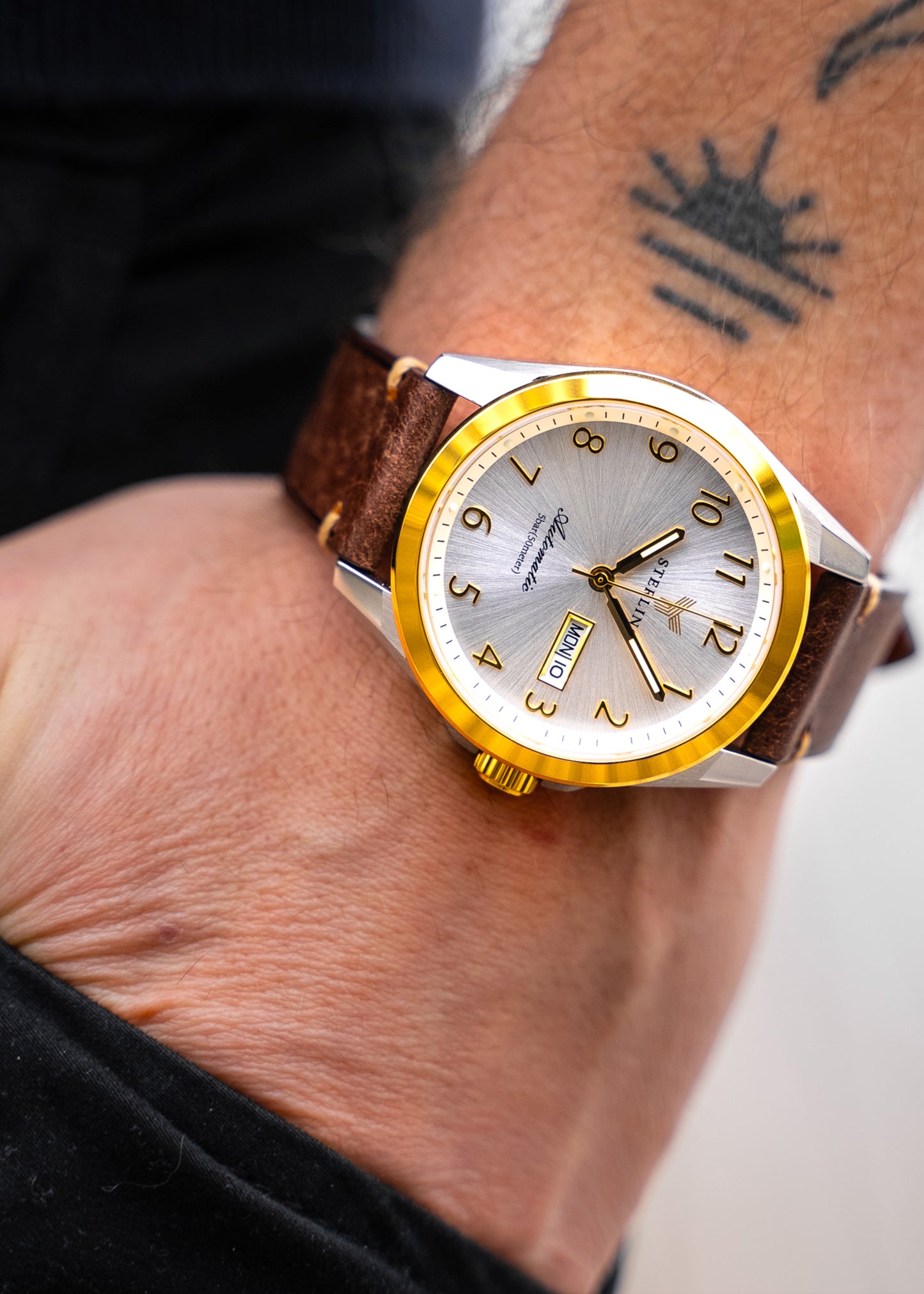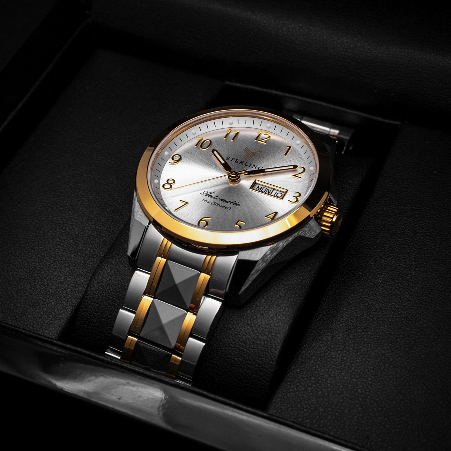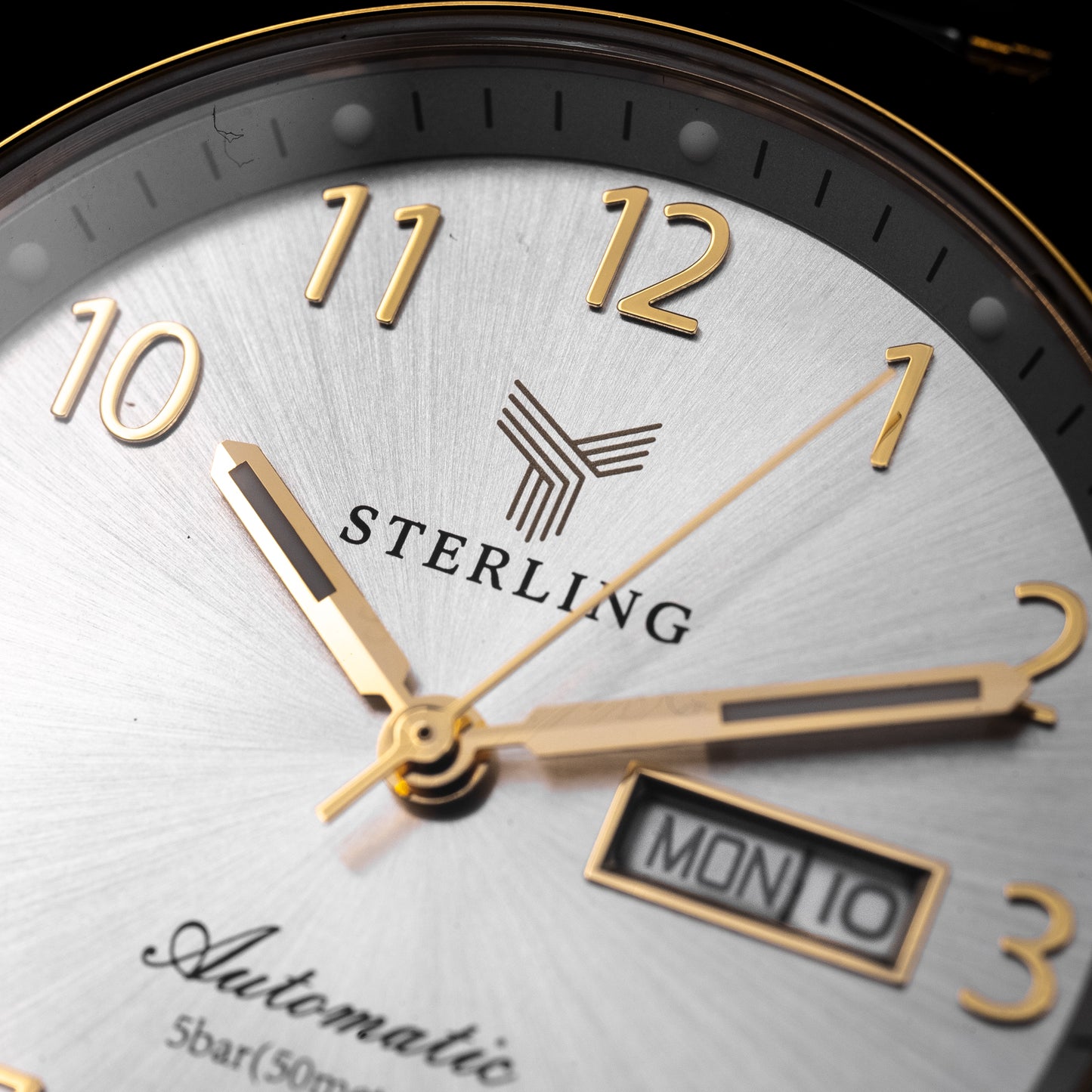 Sterling Legacy er designet med et tidløst udtryk, hvor klassiske elementer møder moderne detaljer. Den hvide urskive har en let sunburst-effekt, der reflekterer lyset subtilt og giver dybde til designet. De elegante visere har en slank profil, og sekundviseren har en glidende bevægelse, der understreger urværkets mekaniske natur.
