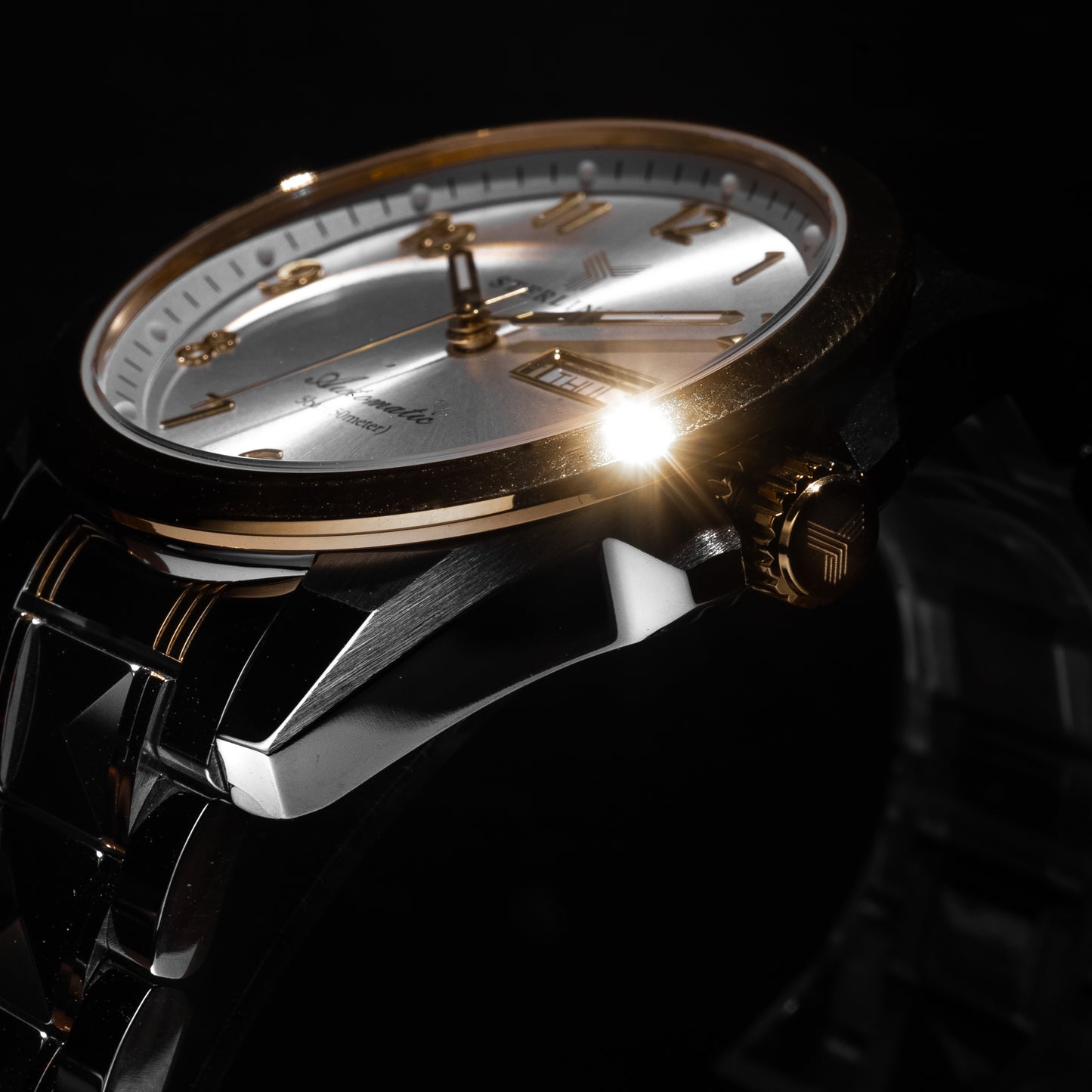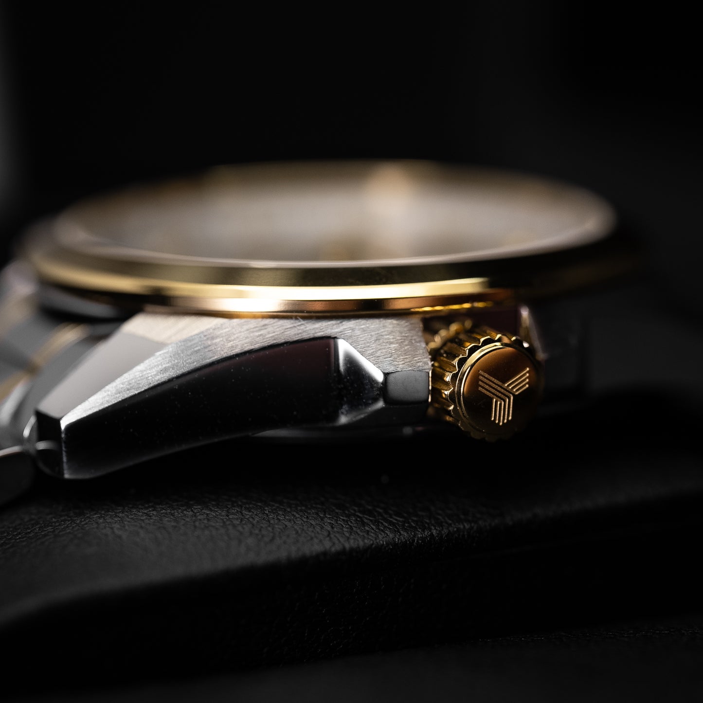 Urkassen er fremstillet af rustfrit stål med en poleret finish, mens den guldbelagte bezel tilfører et ekstra visuelt lag. Den afrundede kant og de bløde overgange mellem kasse og rem giver et sammenhængende udtryk, der fungerer både til hverdagsbrug og mere formelle anledninger. På højre side af urskiven findes en dag- og datovisning, som er diskret integreret for at bevare det rene design.