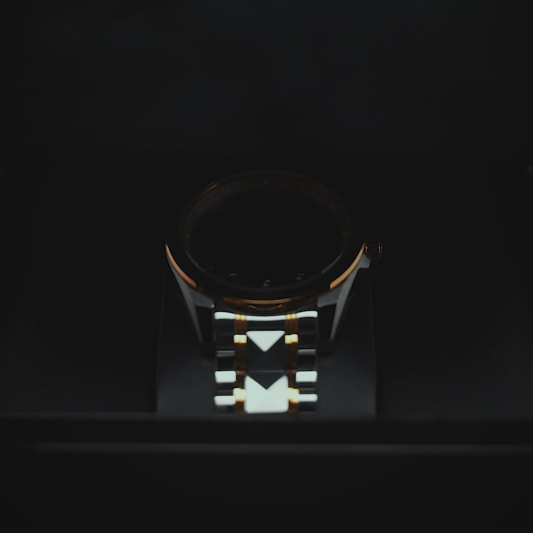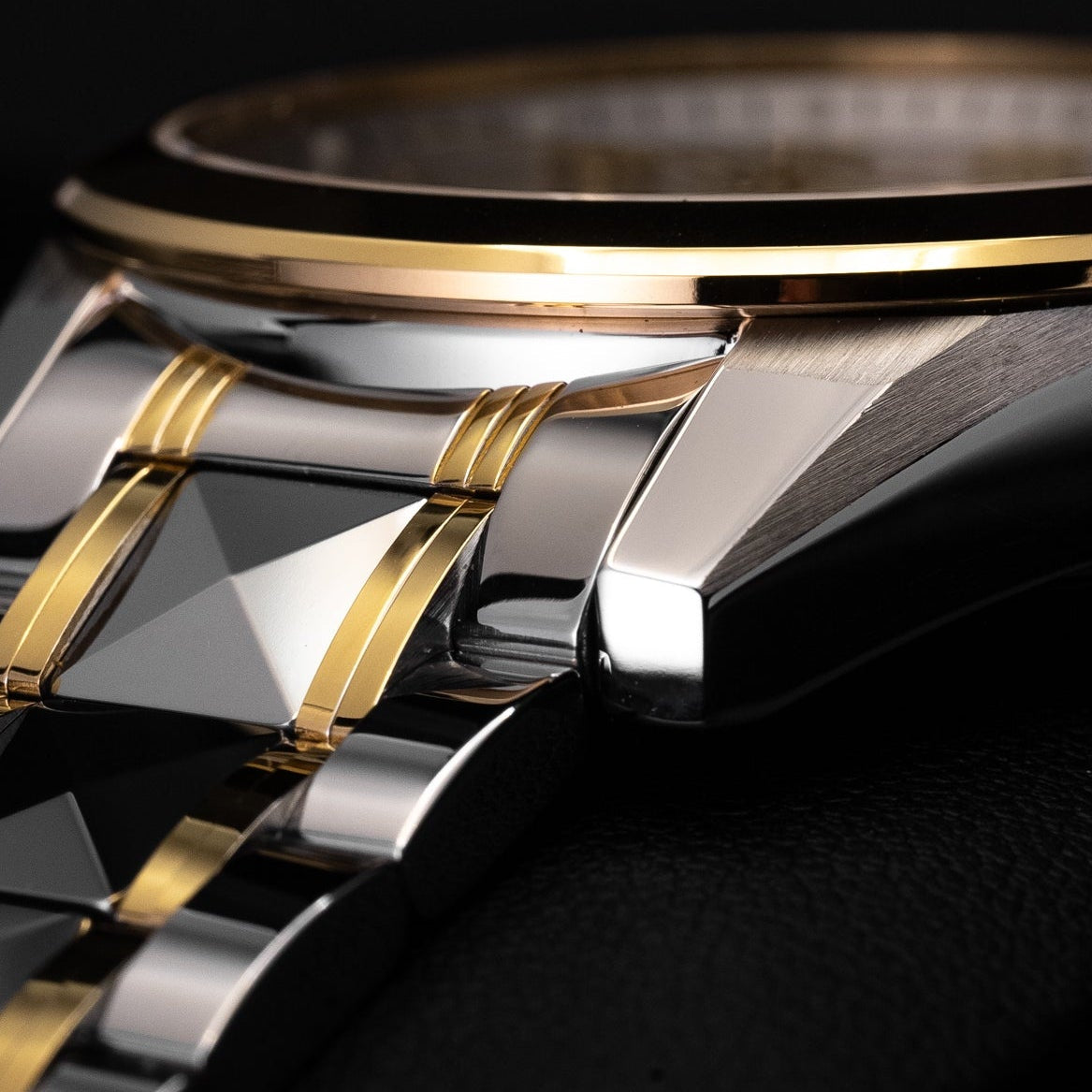 Remmen er fremstillet af 316L rustfrit stål med en kombination af børstede og polerede overflader, hvilket giver en varieret tekstur. De guldbelagte detaljer løber langs midten af remmen og skaber en rød tråd til urkassen. Midterleddene har en diskret pyramidestruktur, der tilføjer en taktil dimension og giver remmen et karakteristisk og iøjefaldende udseende.