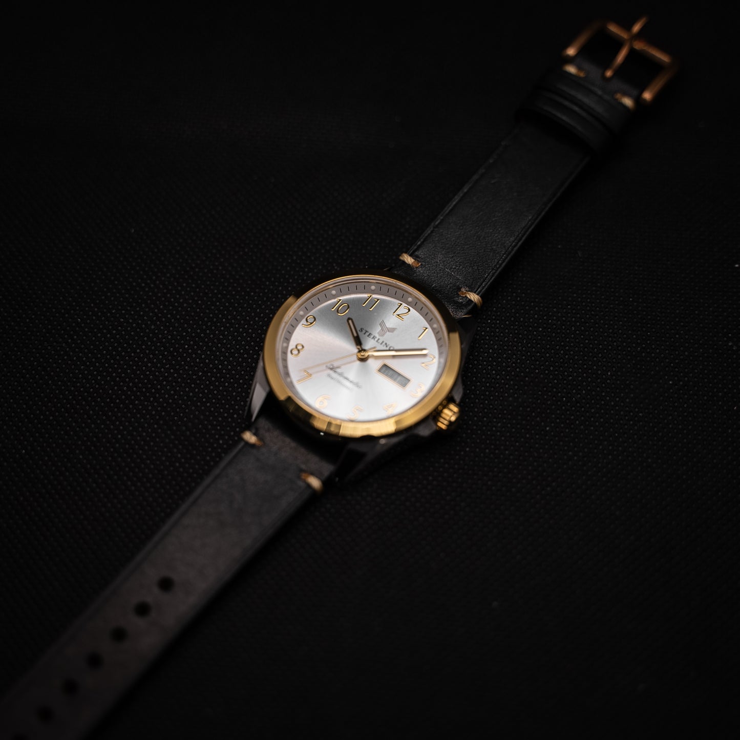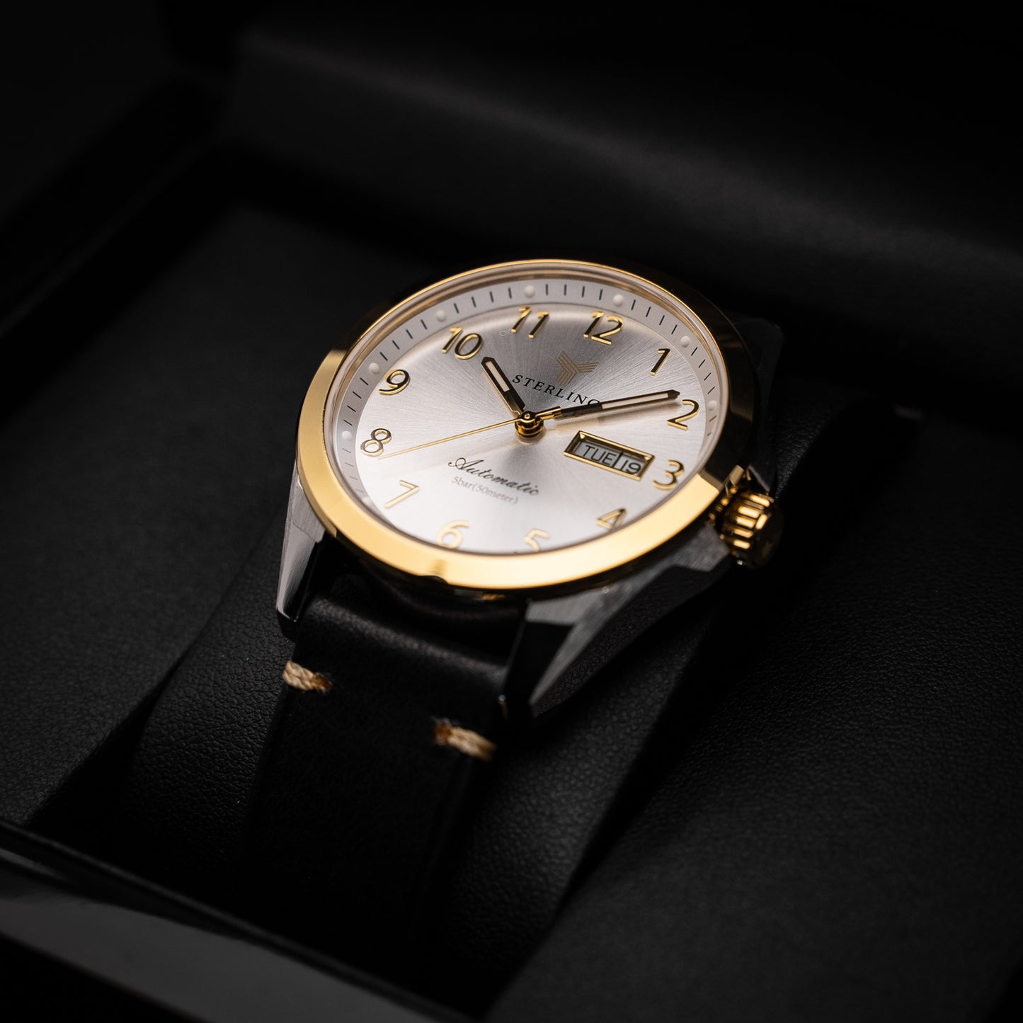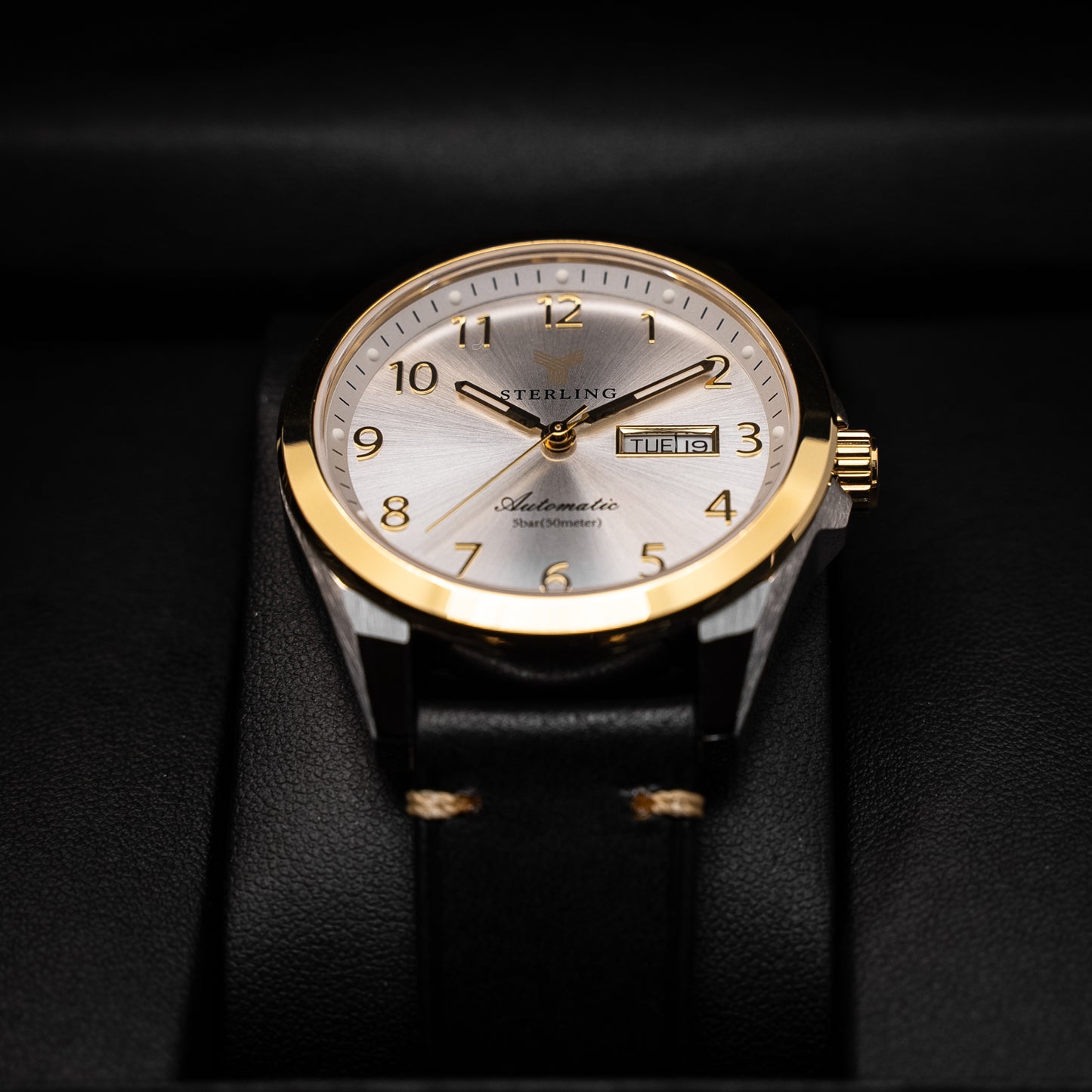 Sterling Legacy er designet med et tidløst udtryk, hvor klassiske elementer møder moderne detaljer. Den hvide urskive har en let sunburst-effekt, der reflekterer lyset subtilt og giver dybde til designet. De elegante visere har en slank profil, og sekundviseren har en glidende bevægelse, der understreger urværkets mekaniske natur.