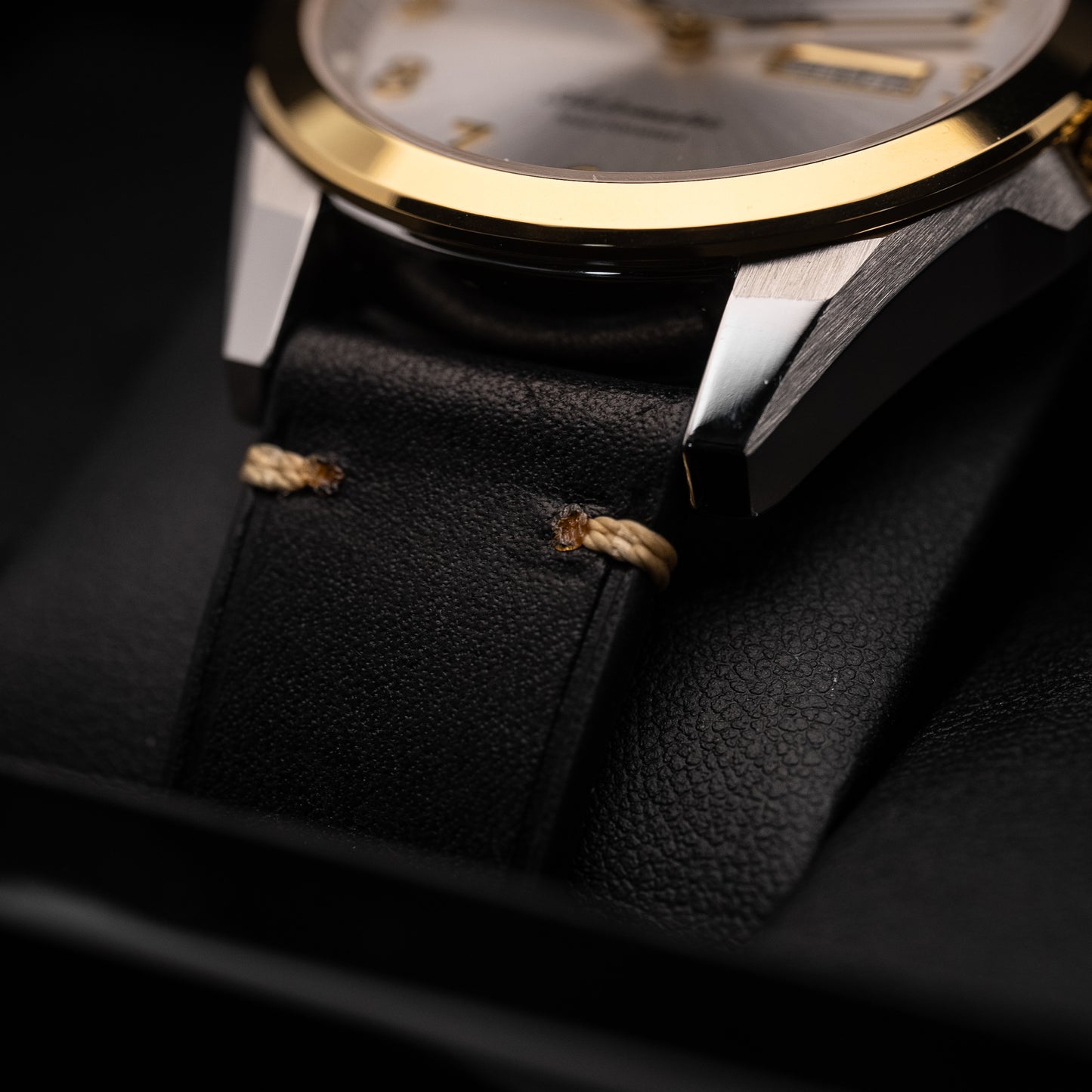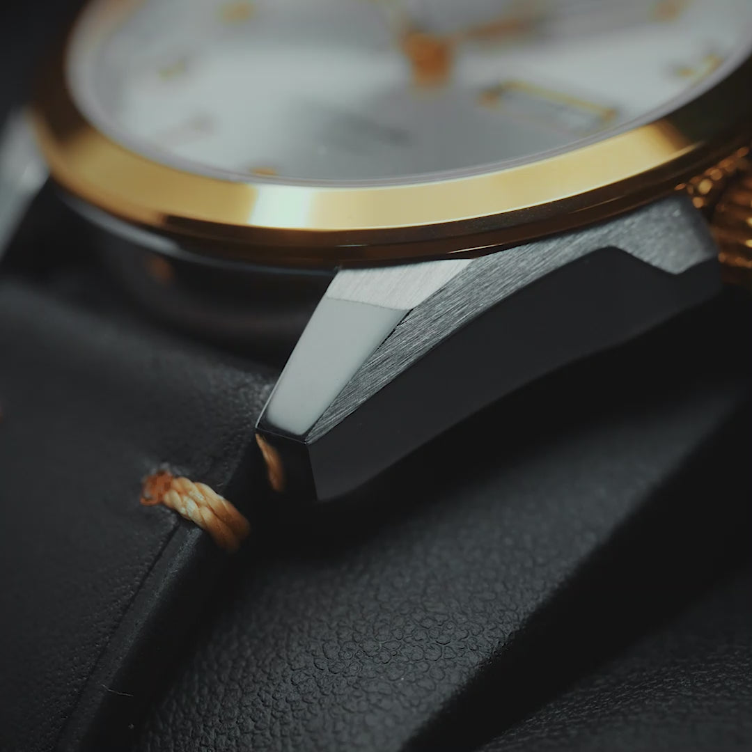 Urkassen er fremstillet af rustfrit stål med en poleret finish, mens den guldbelagte bezel tilfører et ekstra visuelt lag. Uret fungerer både til hverdagsbrug og mere formelle anledninger. På højre side af urskiven findes en dag- og datovisning, som er diskret integreret for at bevare det rene design.