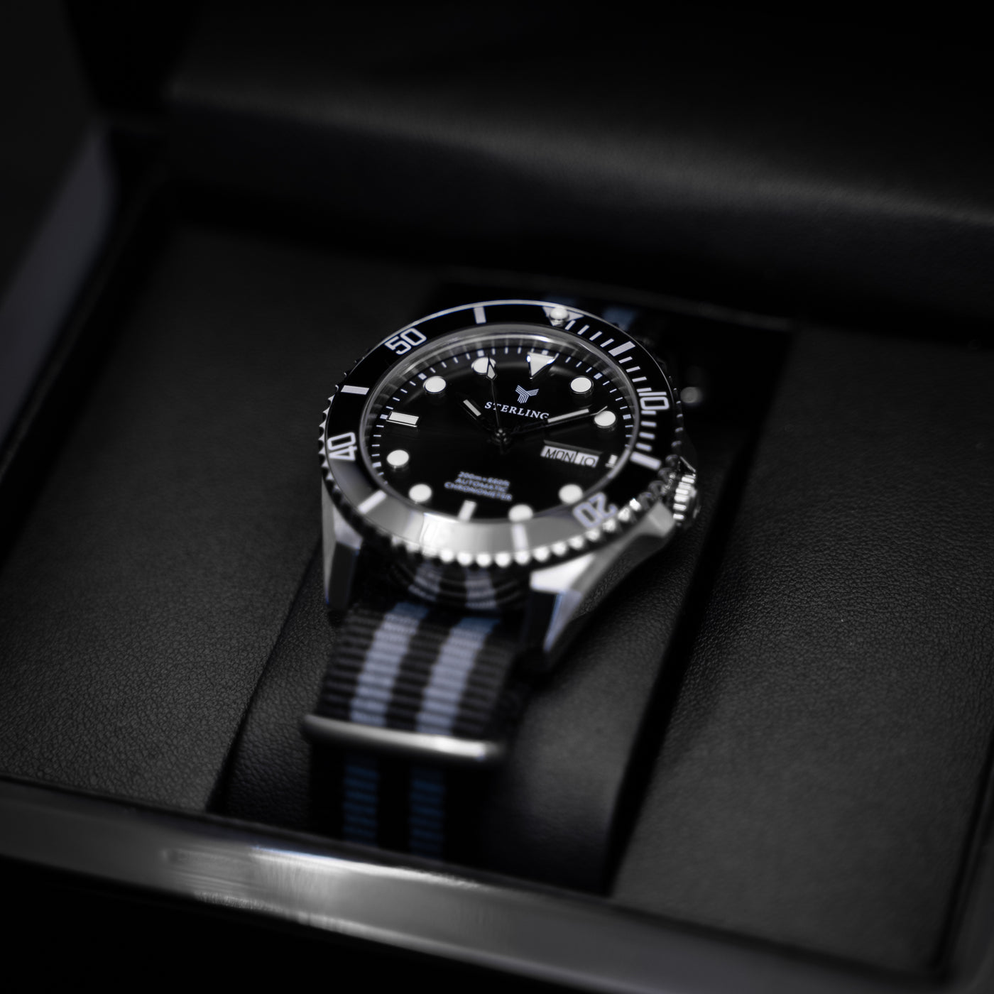 Sterling Descend er en hyldest til det legendariske Rolex Submariner. Vi har justeret detaljerne efter vores præferencer og har formet et fantastisk alternativ til det ikoniske ur. Med vores egen urkasse, rem og visere karakteriserer vi vores egen stil, uden at gå på kompromis med den oprindelige Submariner charme. Sterling Descend er udrustet med ridsefrit safir krystalglas og er vandtæt ned til 200m.